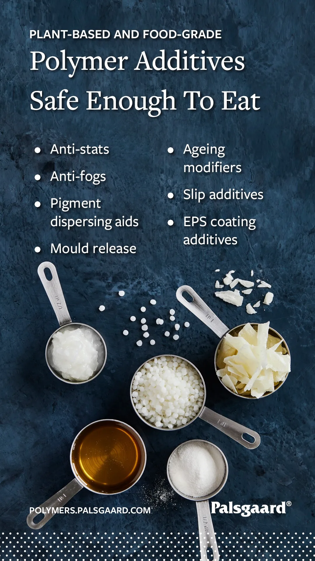 The polymer industry also needs sustainable alternatives to petrochemical-based products, such as ethoxylated amines and amides, that do not compromise the quality and functionality of the end products. Based solely on vegetable oils and produced in CO2-neutral factories, Palsgaard offers the most sustainable additives on the market.